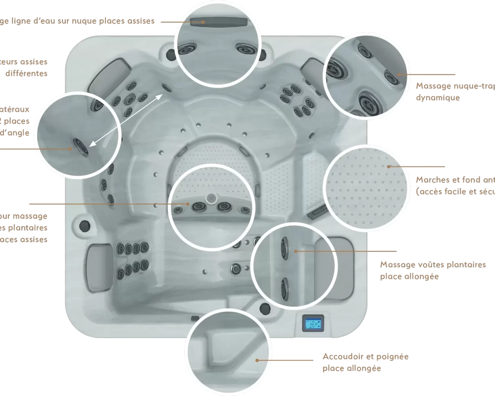 Visitez nos showrooms pour tester ce jacuzzi 4 places exceptionnel. Nos conseillers experts vous guideront dans votre choix et vous proposeront une solution personnalisée adaptée à vos besoins.